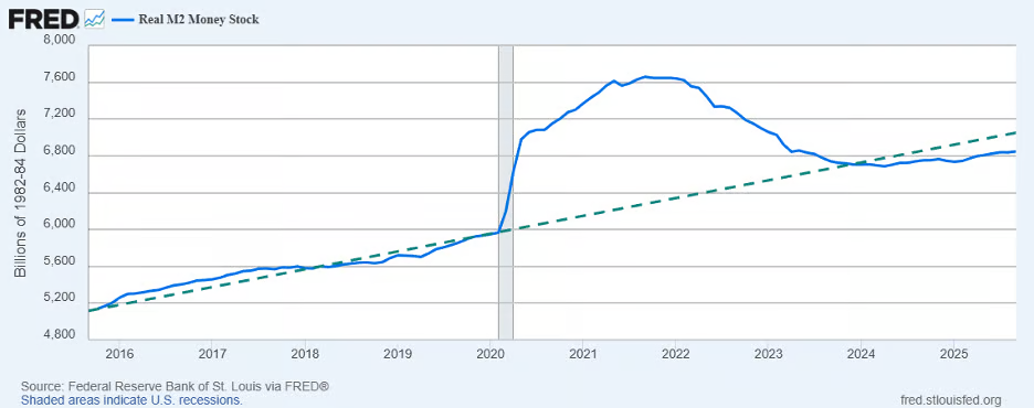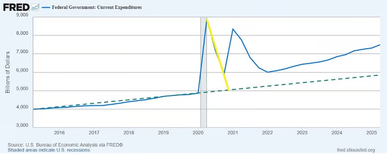 The huge increase in the federal deficit began with the onset of the pandemic, briefly returned to the already-high Obama-Trump trendline in late 2022, and then moved slightly higher than the pre-pandemic trend and stayed there until mid-2025: