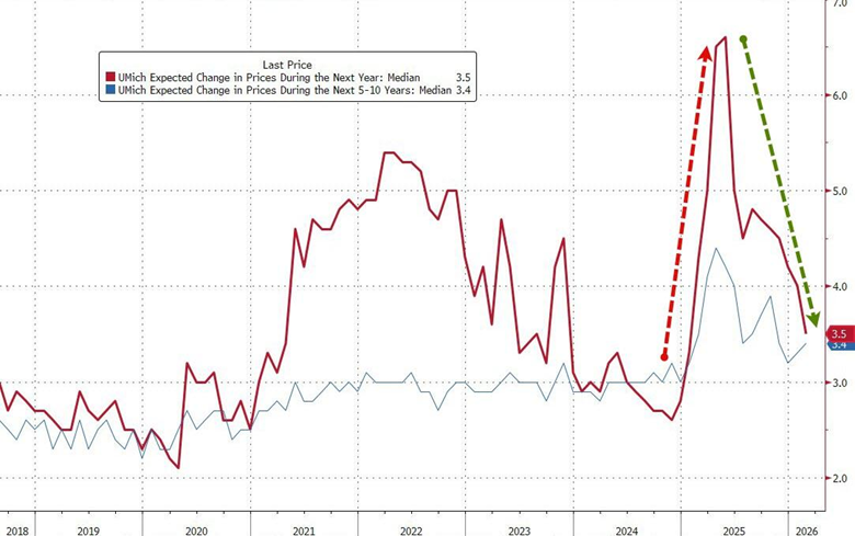 “Inflation expectations for the next 12 months plummeted to 13-month lows (while medium term expectations rose modestly),” ZeroHedge reported.