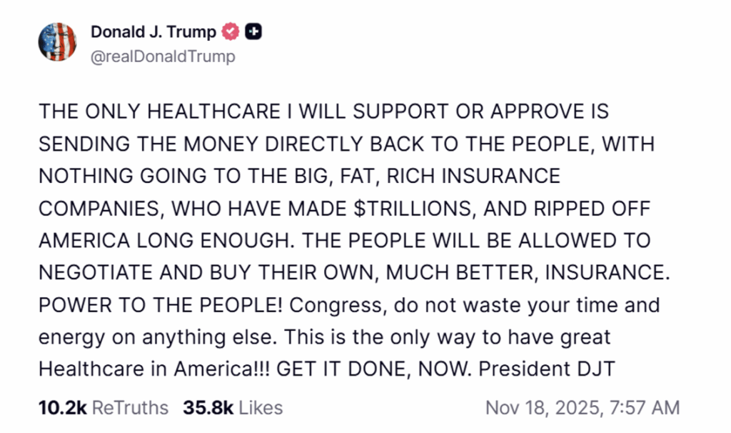 President Donald Trump sent out a very surprising statement on Truth Social on November 18, 2025. Though it applied to a specific policy issue—the expanded Obamacare subsidies which were scheduled to expire at the end of 2025—Trump’s statement was surprising because it marked a pivot toward a new perspective on health care reform: cash as king. This seemingly ephemeral social media post and the thought behind it could guide the way toward momentous positive reforms: